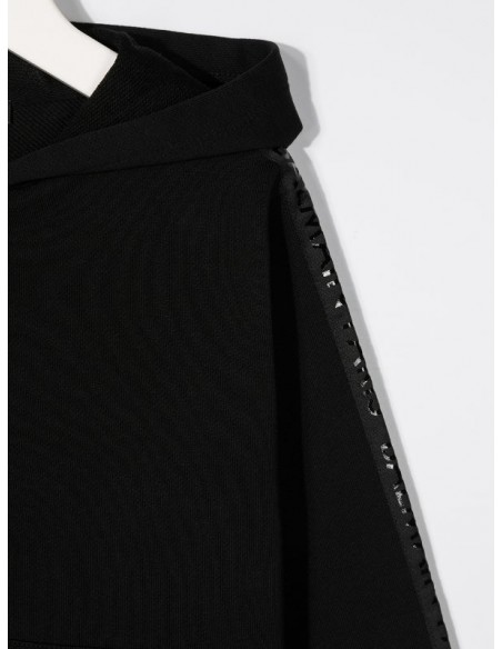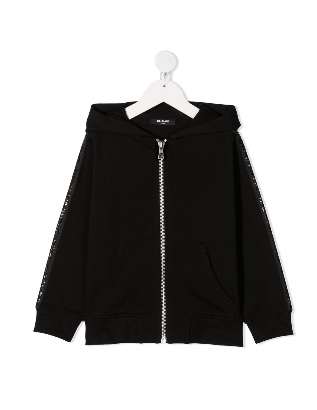 Felpa Balmain kids con cerniera, con logo sulle braccia, cappuccio, chiusura frontale, maniche lunghe e orlo a coste. Materiale cotone, colore nero.