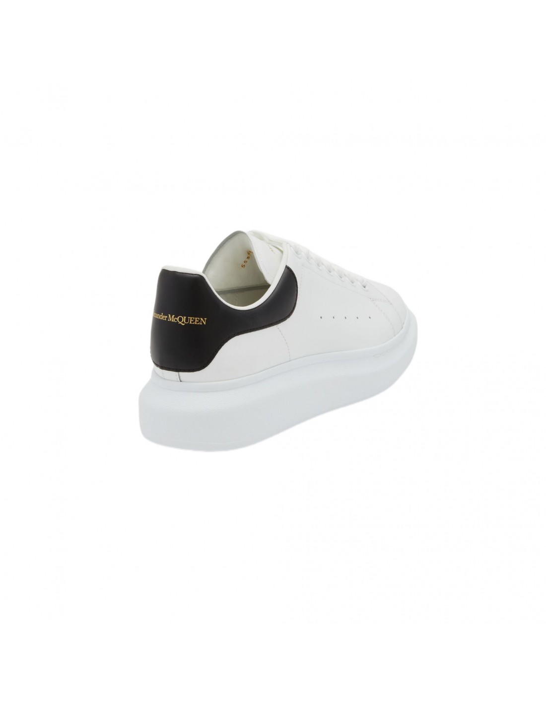 Sneaker Oversize da Uomo in Bianco/nero Sneakers bianche in vitello liscio lucido con lacci, punta oversize rotonda in gomma e dettagli neri sulla parte posteriore. Finitura traforata sulla parte esterna della scarpa. Interno foderato in capretto e 7 fori in metallo. Lacci piatti e logo Alexander McQueen sulla linguetta e sul tallone. Suola oversize in gomma. Fornite con un paio di lacci bianchi extra. Dettagli Prodotto: • Vestibilità esatta Materiale: 100% Pelle di vitello Product Code: 553680WHGP59061