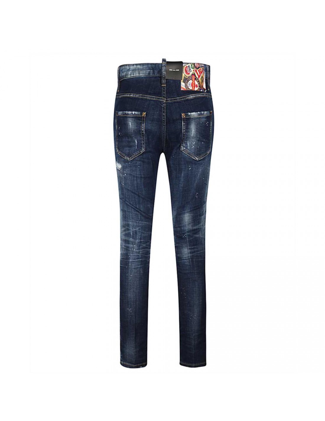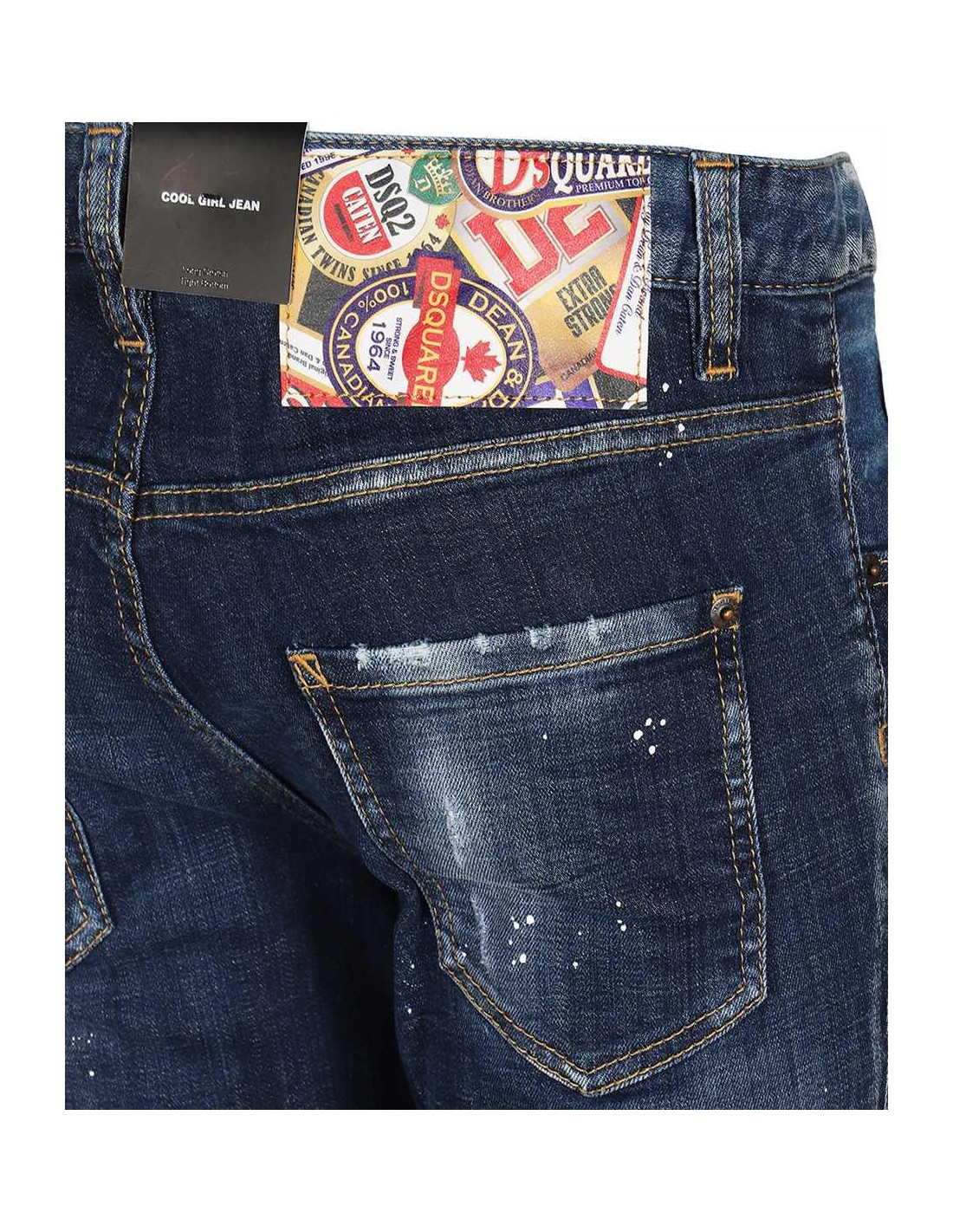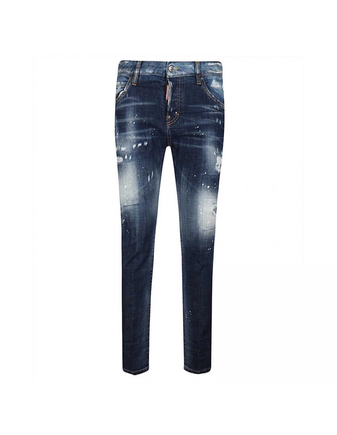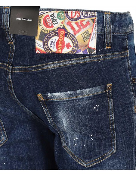 Jeans Dsqaured donna, colore blu, macchie di vernice bianca, 5 tasche. Chiusura con bottoni. Patch logo silla chiusura. Vestibilità "cool girl jeans".