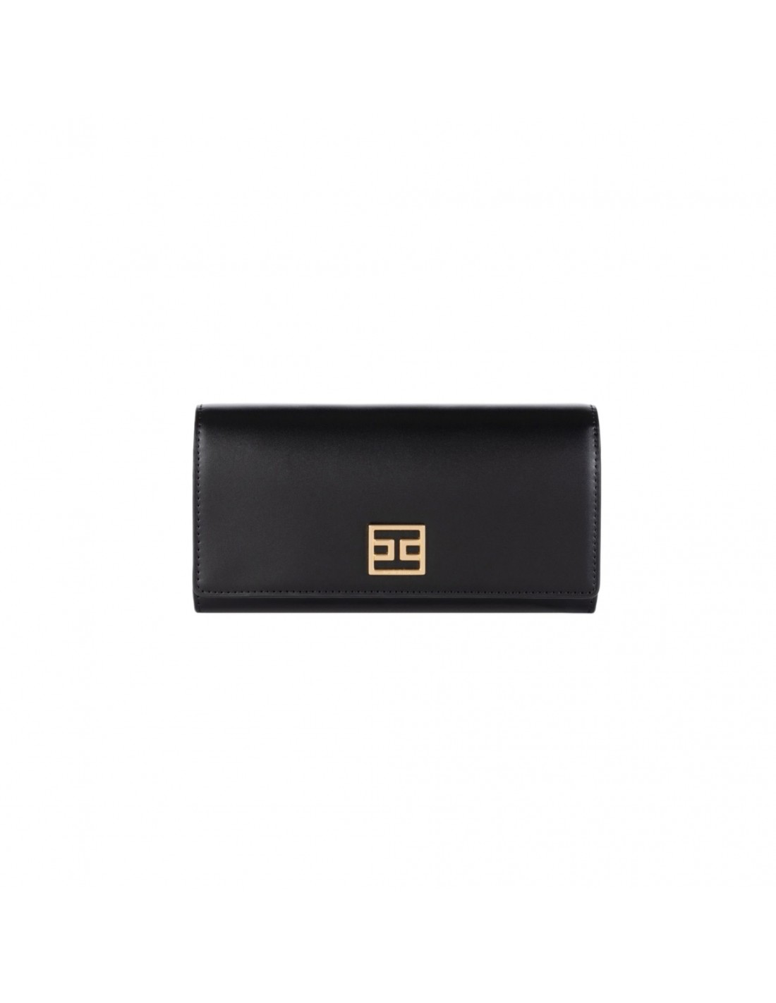 Portafoglio grande realizzato in materiale sintetico effetto pelle dalle texture lucide. Ha patta impreziosita dalla placca con logo in metallo dorato.