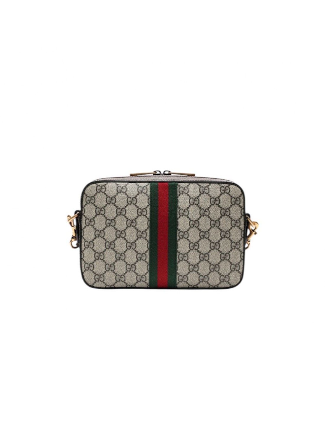 Borsa a spalla di Gucci in tessuto GG Supreme beige ed ebano, un materiale a ridotto impatto ambientale, caratterizzato da chiusura con cerniera, tracolla removibile con motivo Web rosso e blu, fodera in cotone e lino, doppia G, finiture in pelle marrone, finiture anticate color oro ed una tasca interna con cerniera.