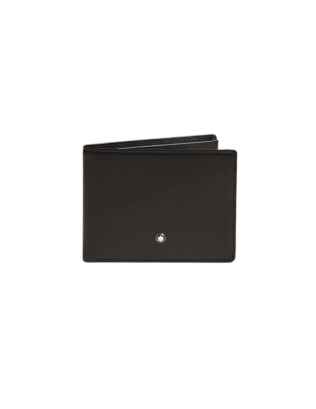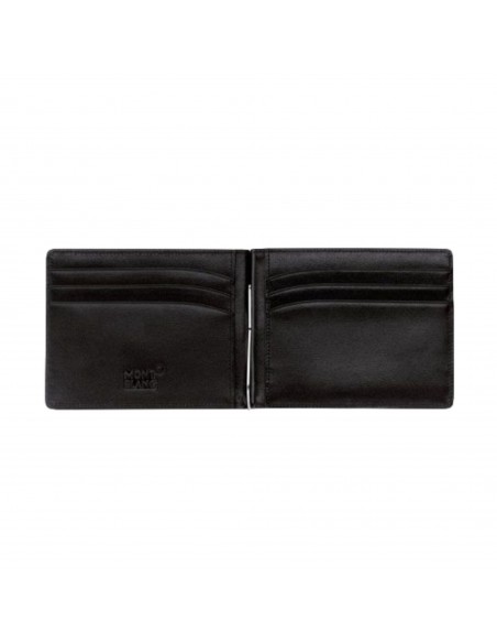 Sottile ed elegante, questo portafoglio pieghevole Meisterstück a 6 scomparti è dotato di un elegante fermasoldi in metallo per le banconote. Realizzato in pelle liscia e foderato in tessuto nero, il portafoglio presenta anche sei aperture per carte di credito.